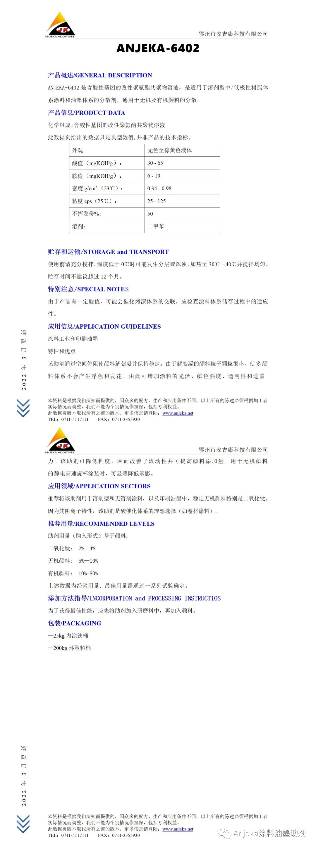 ANJEKA6402 潤濕分散劑 可替代EFKA4010 針對無機(jī)及無機(jī)顏料的分散