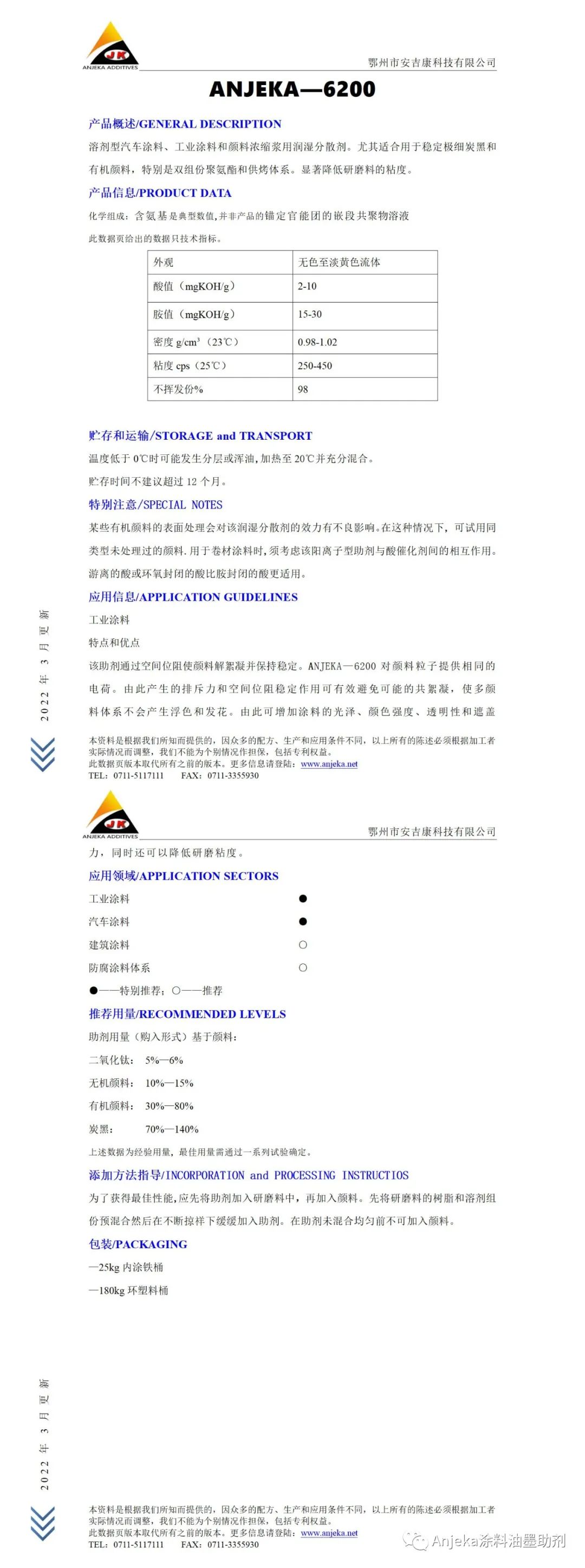 Anjeka6200油水通用型高分子分散劑 替代路博潤20000 水性涂料印刷油墨和膠粘劑