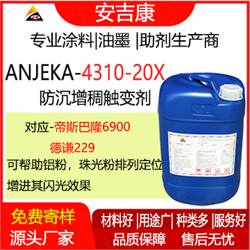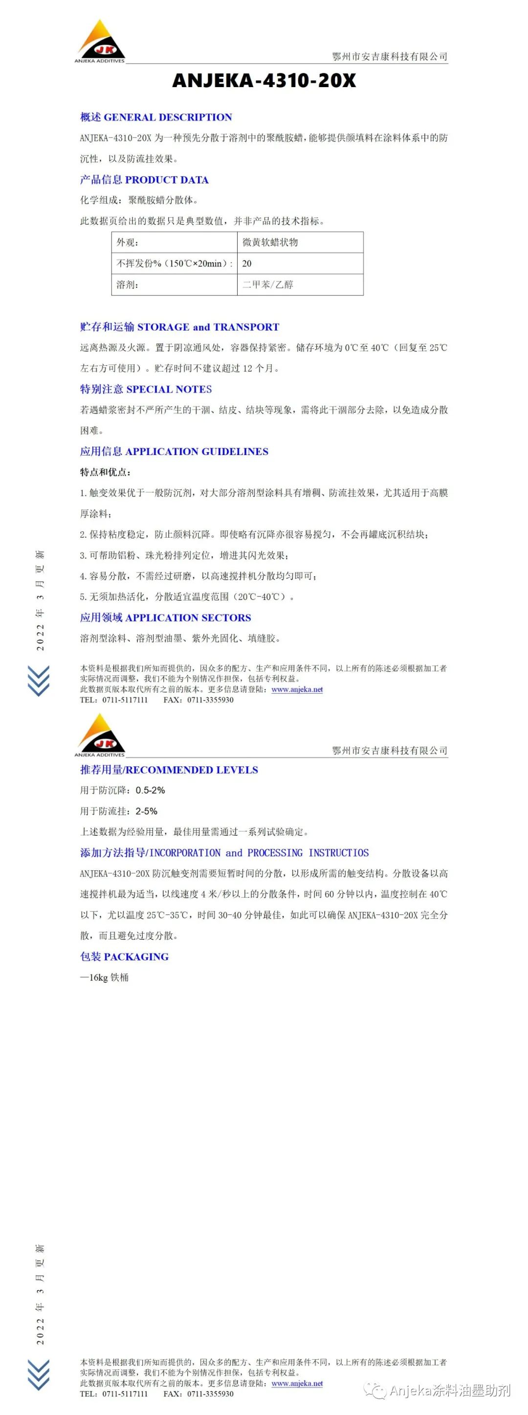 ANJEKA-4310-20X為一種預先分散于溶劑中的聚酰胺蠟,能夠提供顏填料在涂料體系中的防沉性,以及防流掛效果。