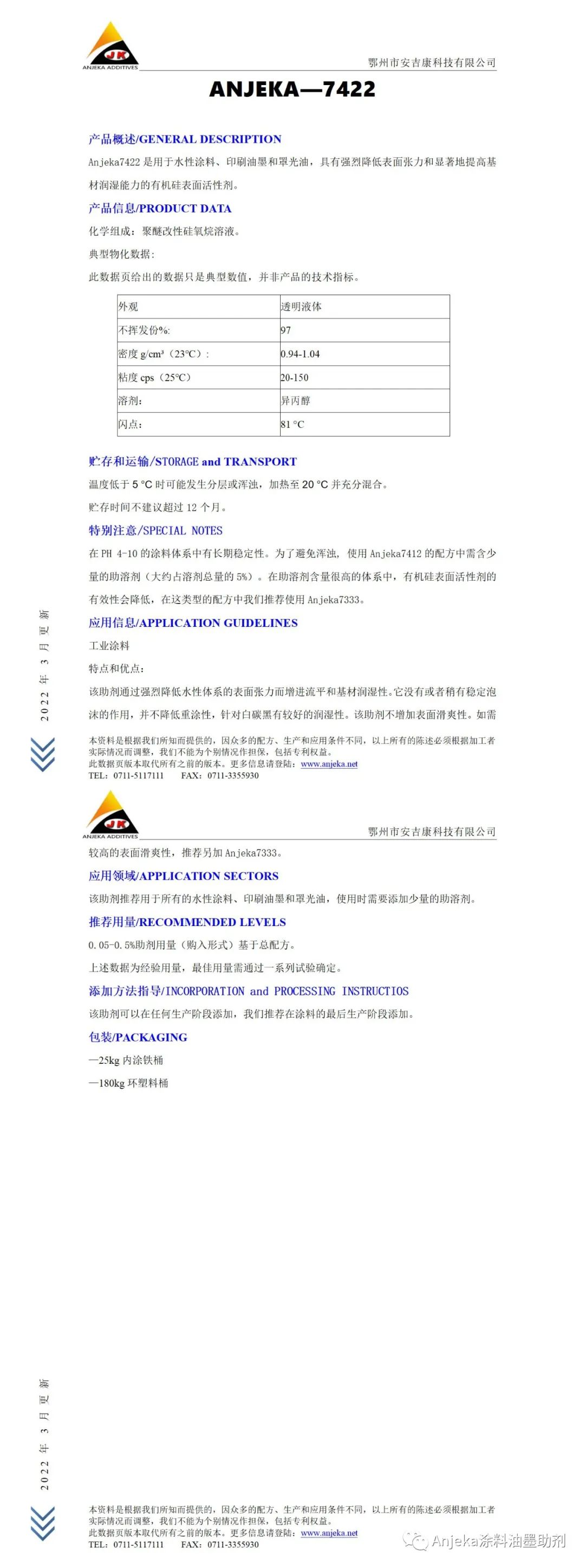 Anjeka7422是用于水性涂料、印刷油墨和罩光油,具有強烈降低表面張力和顯著地提高基材潤濕能力的有機硅表面活性劑。