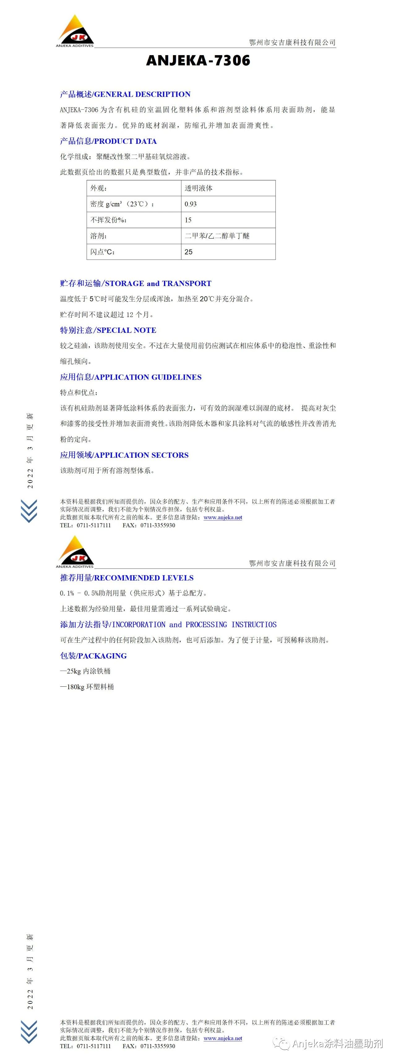 Anjeka 7306含有機(jī)硅的固化塑料體系和溶劑型表面助劑 流平性好